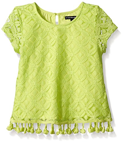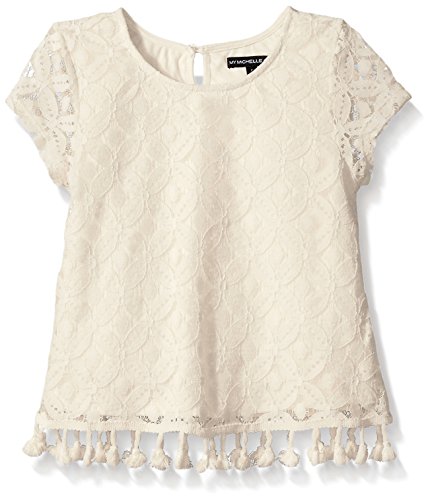 Short sleeve top with fringe hem and all over lace with keyhole back
