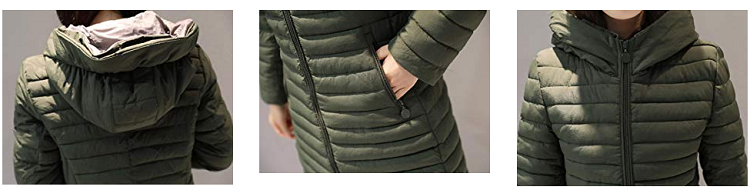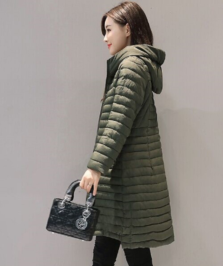 大きなフードをつけている中綿ダウンコートの一枚です、