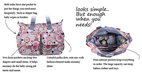 - Feature : Both sides have one pocket to put things you need.Four interior pockets keep everything in order, the large capacity can keep babies clothes and toys. / The inner pocket and the large capacity keep everything in order. The two sides pockets to put the things that you need most frequently. Like snacks. / The extra liner can put many other things, like milk bottle.Soft and comfortable changing pad is another gift from us. No cold and hard changing table for babies anymore. / The extra straps that make you more convenience to carry the diaper bags.The outside pockets that can out diapers, very convenience. / The zippers were tested many times. We promise they are strong enough to be used for a long time.