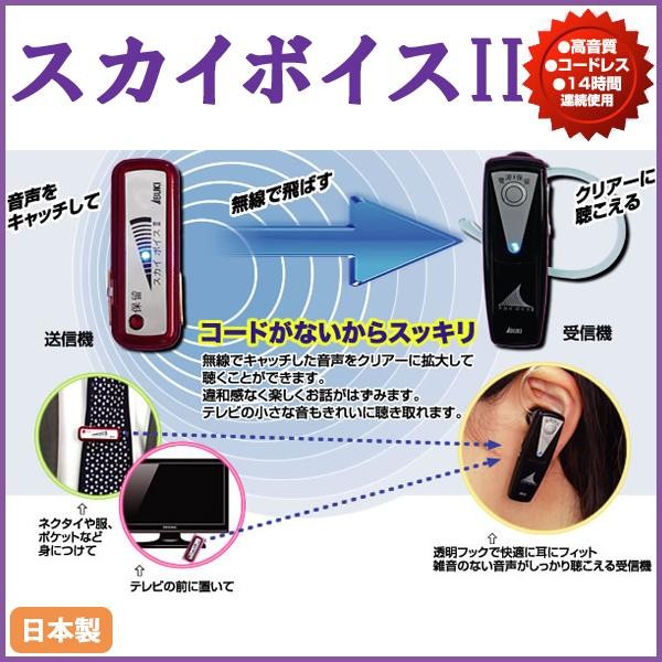 | キャッチした音声を無線で飛ばして、耳に掛けた受信機から聴くことが出来ます。コードがないからスッキリしていて便利です。送信機・受信機を一緒に充電できる専用充電器もセットしています。 |