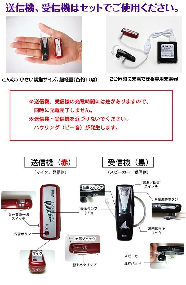 キャッチした音声を無線で飛ばして、耳に掛けた受信機から聴くことが出来ます。コードがないからスッキリしていて便利です。送信機・受信機を一緒に充電できる専用充電器もセットしています。 |