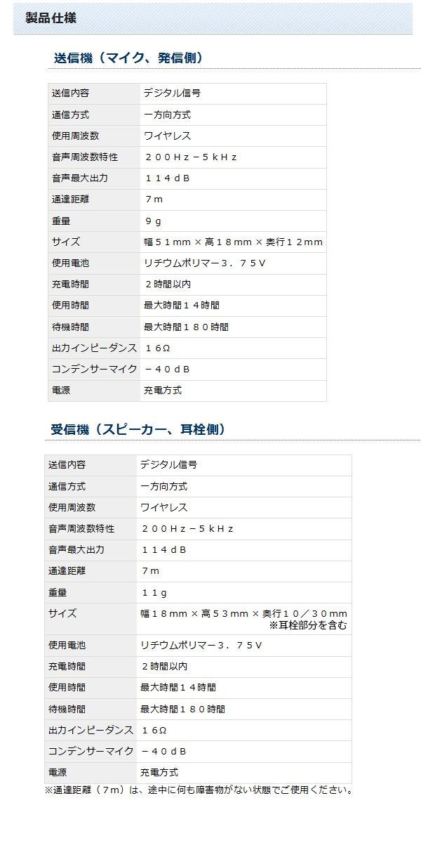 | セット内容 | 本体(送信機・受信機)、専用充電器、耳栓パッド(L・Mサイズ各1個)、保証書兼取扱説明書(期間:本体1年、付属品6ヶ月) |