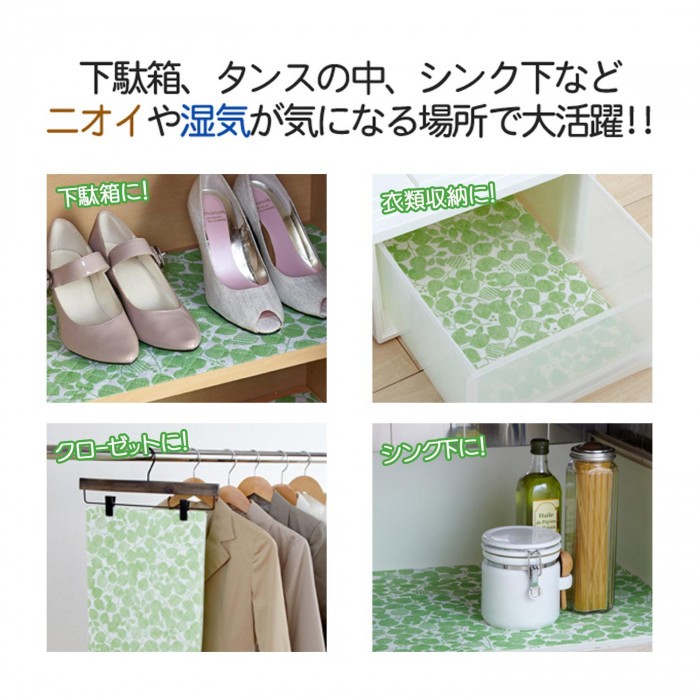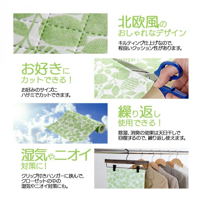 | 下駄箱・タンスの引き出し・シンク下など、湿気やニオイが気になる場所で大活躍♪クリップ付ハンガーに挟んで、クローゼット内にも!!お好みのサイズにハサミでカットしてご使用ください。使いやすい、北欧風のオシャレなデザイン。 |