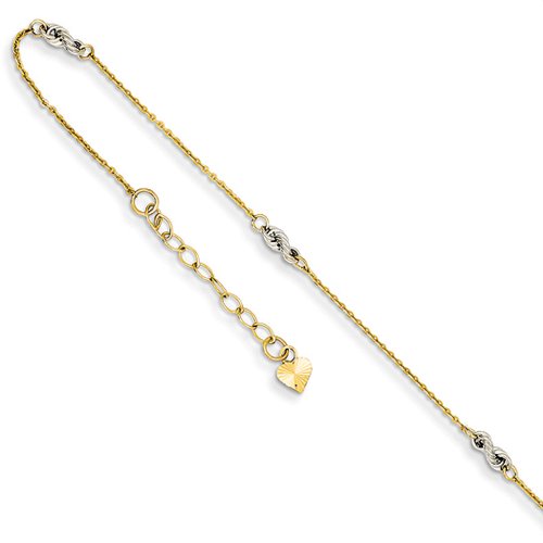 Make a soft feminine statement with this 14k two-tone gold bracelet that adds unexpected shimmer around your ankle. Measuring 9 inches in length, this dainty 1mm cable chain accented with 3mm white gold rope chain stations includes a 1-inch extender and spring ring clasp.Feature