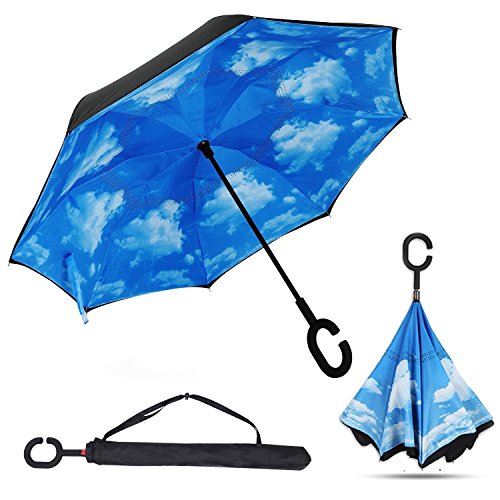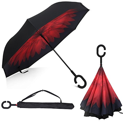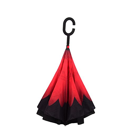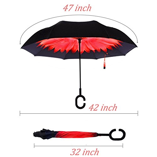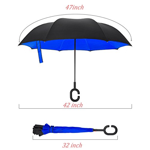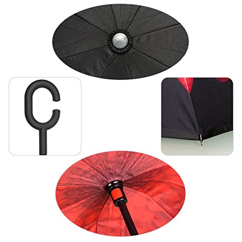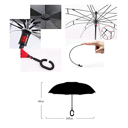-. Feature : ◆Durable Materials---Made of water repellent pongee fabric, breathable double layer canopy and smooth top, using high quality electroplated steel shaft and premium resin-reinforced fiberglass ribs. / ◆Hands Free Handle---The C-shaped hand grip allows you to play with mobile phone when you hold the reverse windproof umbrella with your wrist and lift a bag in the rain, making it convenient for mothers to hold the umbrella when they have baby in arms. / ◆Double Layer Design---The wet side of the umbrella faces inward when closed, only the dry side exposing,easier to open when coming out of a car or other covered area. Make it easy for you on raining day, won't wet your car, documents or others. Advanced double layer ribs made the inverted umbrella more sturdy. / ◆Easy To Storage---It can stand up on its own, ideal for when you have nowhere to prop your umbrella up against. / ◆Gift Idea---A necessary tool for your car and outdoor travel,wind proof, sun & rain available and anti-uv, make it a perfect Mother's Day gift,Birthday gift or any other Holiday Gifts for your parents, friends, colleagues and lovers.