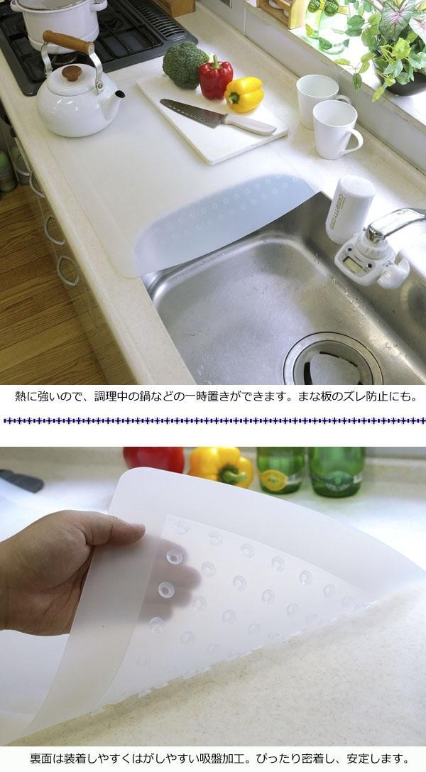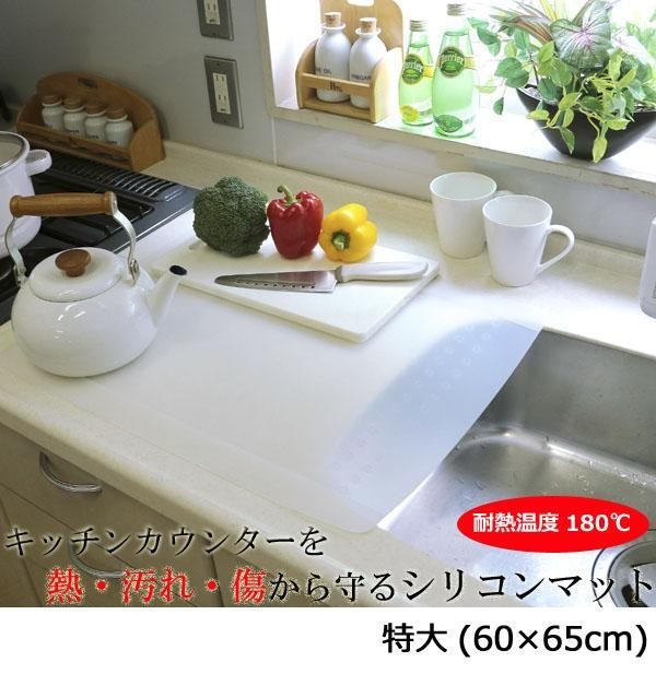 | ●耐熱温度は、180度までの高温対応。 | | ●環境や体にもやさしい素材を使用。 | | ●水切リカゴの下に引けば、水がシンクに流れる設計。 | | ●食器洗浄機で洗えるのでいつでも清潔。 | | ●表面を溝なしタイプに改良。従来の溝に詰まる汚れの不快感を解消。 |