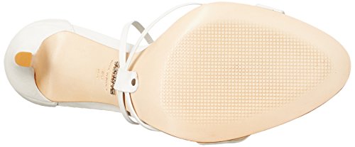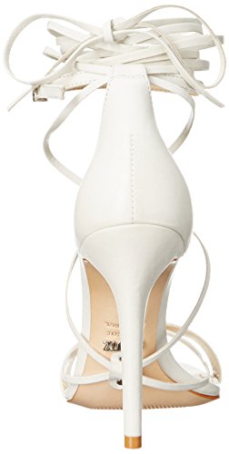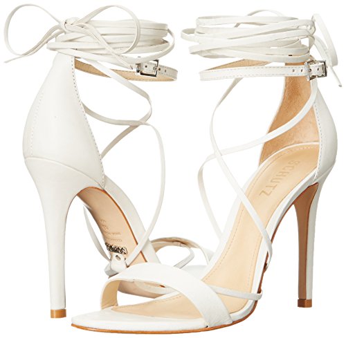 High-heeled sandal featuring crisscross straps at vamp and coiled cuff at ankle