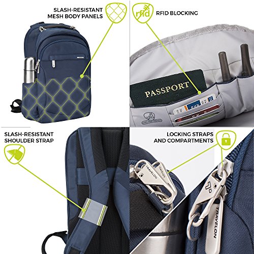 Studio : Travelon Publisher : Travelon Binding : Apparel Product Description The Travelon Anti-Theft Classic Large Backpack has all the space, organization and protection you'll need in a day bag or carry-on. Stay organized with 3 compartments. The front compartment has RFID blocking card and passport slots, an open top and zip pocket, 2 pen loops and a tethered key clip with LED light. The rear compartment is fleece lined to hold a laptop to 15.6 inches and has a padded pocket for an iPad or tablet. The roomy main compartment has a wall pocket to hold large items. A top grab handle and add-a-bag strap make it versatile and easy to carry. Front zippered pocket for quick grab items. Travel securely and confidently with Travelon's anti-theft technology, including slash-resistant construction, locking compartments, and slash-resistant and locking straps to keep you and your belongings protected. 0