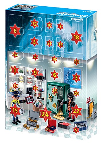 -. Feature : Looks like a thief is after the jewels, but the police are in Pursuit! / The Advent calendar "jewel thief police operation" with lots of glittering trinkets contains twenty-four surprise items for each day leading up to Christmas / Once all the pieces are revealed, play out an exciting police Chase and capture! / For an extra surprise, the included safe can be used a piggy bank! / Includes backdrop, two figures, jewelry case, police motorcycle, gold bars, money, handcuffs, wanted poster, functioning safe, and tons of other accessories