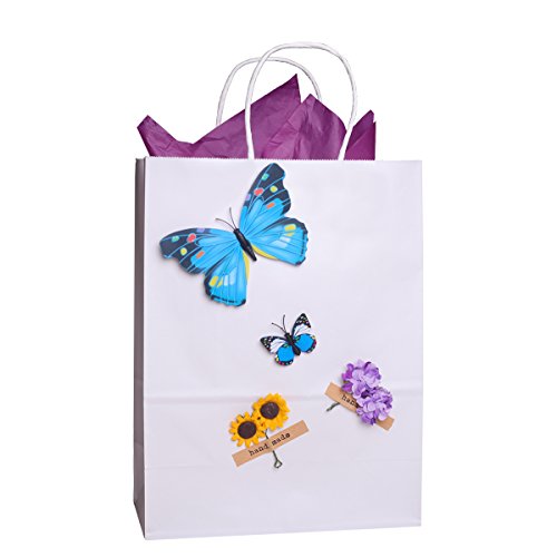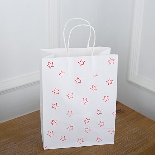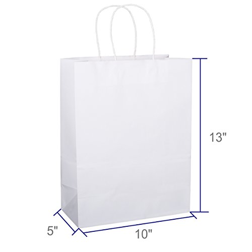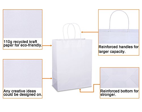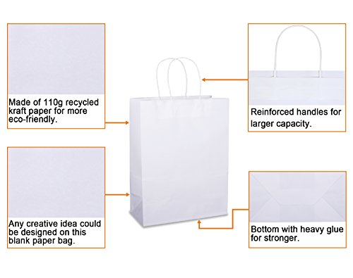 ?Our kraft shopping bags are glossy paper which make them a little more elegant looking than the plastic which tend to tear easily. ?The retail paper bags are perfect size and work beautifully for your business. At this price, they are nice to be able to place product in such a simple yet elegant handy bag for your customers. On the other hand, you could print your own labels/logo stamp and put them on each bag, made the shopping bags on behalf of your store. ?Besides, they are perfect for decorating. You could dress the White bags up by using ribbon, markers, glitter and pompoms. It it a great way to let the children bring out their creative side that letting them sit color and draw on these bags. Different color will perfect for Easter, Christmas, Thanksgiving, baby shower, any patriotic holiday or birthday and etc. It is a really fun experience and created a lot of cute memories!