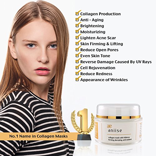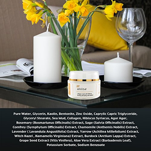 -. Feature : Aniise Face Mask; Packed with collagen, natural oils and plant extracts to improve and promote the skin's elasticity and firmness, Glycerin, grapeseed oil and Aloe Vera have moisturizing properties that hydrate and cleanse gently to improve skin cell production for a healthier, softer and brighter complexion / A Mud Masque with Hibiscus; Hibiscus is one of the most potent anti oxidants that nature has to offer, It has anti aging properties and protects the skin against the elements, such as the sun and the wind, Ultimately, it reduces the appearance of wrinkles firm the and also reverses damage caused by UV rays and pollutants, This miracle plant is also a natural source of alpha hydroxy acids which exfoliate and speed up cell rejuvenation / Removes Blackheads and Fights Acne; This detox pulls out toxins and acne bacteria, When used regularly this mask will help reduce redness, resulting in a smoother complexion / Easy to Use, Without Burning the Skin; Absorbs impurities without removing natural oils, Unlike many masks in the market, it does not have a burning sensation upon application and will not dry the skin after use, It is unisex and can be used for all skin types / Satisfaction Guarantee; We believe in our products and expect only the best results from the products we use ourselves and we know you want and expect the same, Like all products in our collection, our Face Collagen Mask has superior quality and comes with an unconditional, 30 DAY money back guarantee from our manufacturer, If you aren't completely satisfied, simply send 1 email and receive 100% of your money back, Absolutely no questions asked