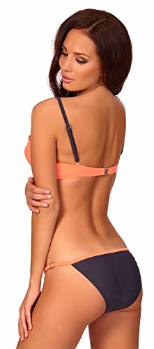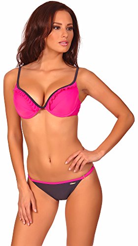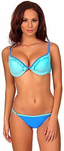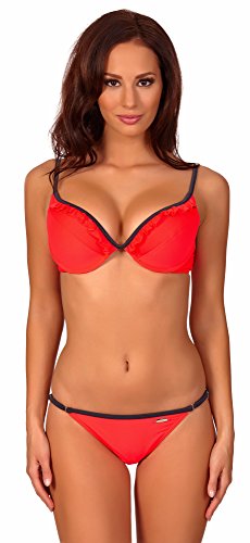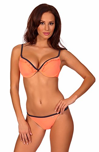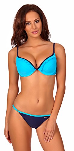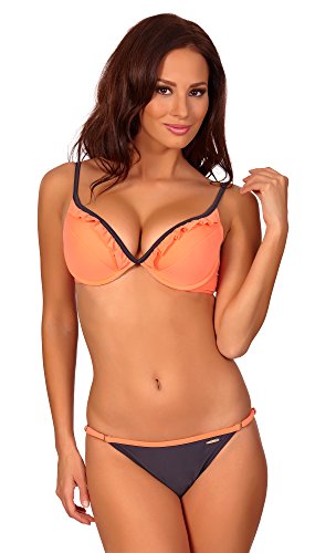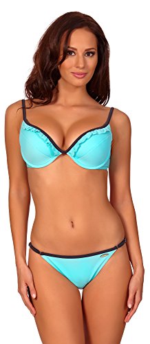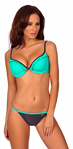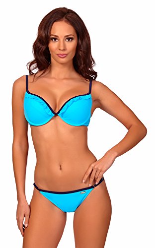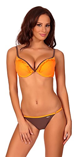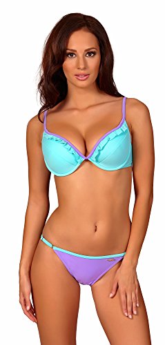 Diser Zweiteiler erweckt einen mädchenhaften Eindruck durch die feine Rüsche am oberen Rand des Tops. Das gepolsterte Oberteil ist mit herausnehmbaren push-up Pads und Bügeln versehen, wodurch ein stabiler Halt garantiert wird. Durch die anpassbaren Träger und den Rückenverschluss lässt es sich sehr einfach auf Ihre persönliche Form einstellen. Der tiefe Ausschnitt und zieht die Blicke auf das Dekolletee und durch die Rüsche wird die Brust optisch größer wirken. Das Unterteil lässt sich ebenfalls einfach an den Seiten anpassen. An der linken Seite des Unterteils ist das Emblem der Herstellers angenäht. Die hochwertigen italienischen Materialien sind beständig gegen Chlor, Meersalz, Sonnencreme und UV-Strahlung (LSF 50+). Der atmungsaktive Stoff dehnt nicht aus, ist sehr sanft auf der Haut zu tragen und bietet einen angenehmen Tragekomfort. Die Farben können von den auf dem Monitor dargestellten Farben leicht abweichen. Die Anordnung der Muster kann leicht von dem gezeigten Bild abweichen, da diese vom Schnitt abhängig ist. Materialzusammensetzung: 80% Polyamid, 20% Elastan.Feature