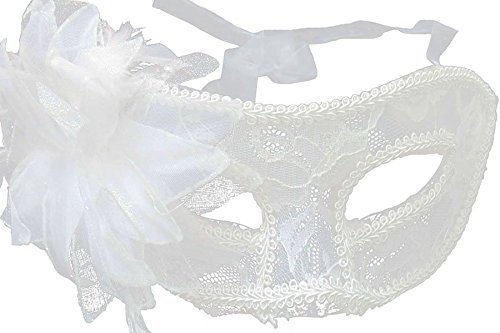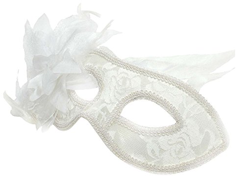 -. Title : Venetian Feathered Sheer Lace Masquerade Costume Party Mask with Flower - Black / White