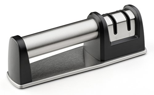 - SAFE, AND EASY-TO-USE. This product is easy to use. Simply position the dull blade on the sharpening slot and enjoy razor-sharpness in just seconds.Our non-slip grip bottom keeps the sharpener steady and easy to hold. With the ergonomic style is great for your wrist and sharpening is effortless. This light-weight yet sturdy model is the best on the market. It stores easily either in the drawer or on the counter top.