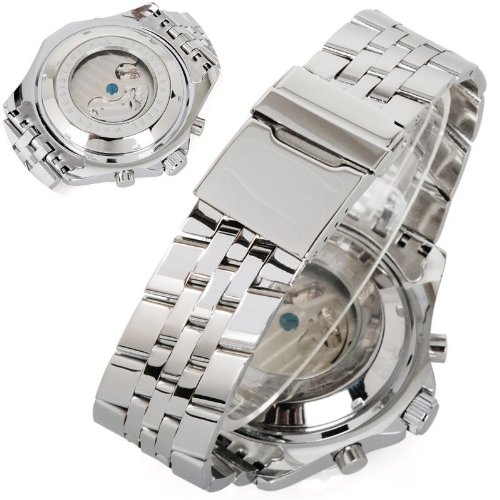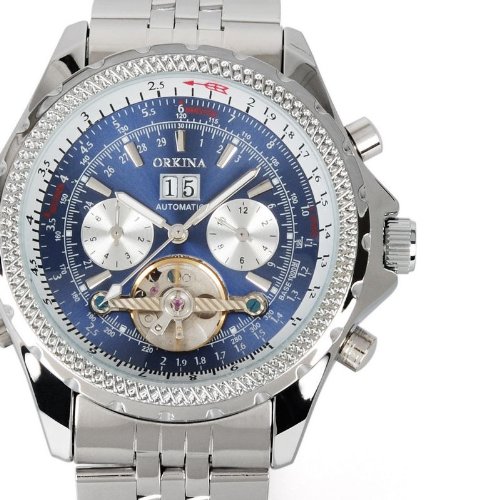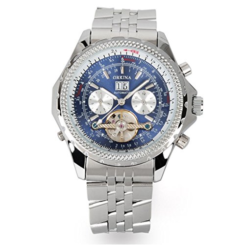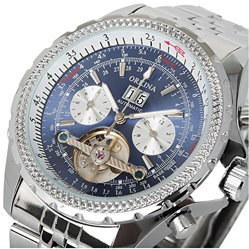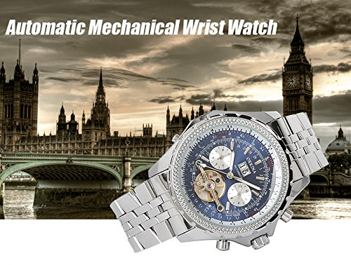GuTe Mechanical GuTe출품 to 루비욘 빅 케이스 강건 두껍 스테인레스 밴드 협기 유니크 트리플 캘린더 블루로 실버 맨즈 자동 감기 손목시계
