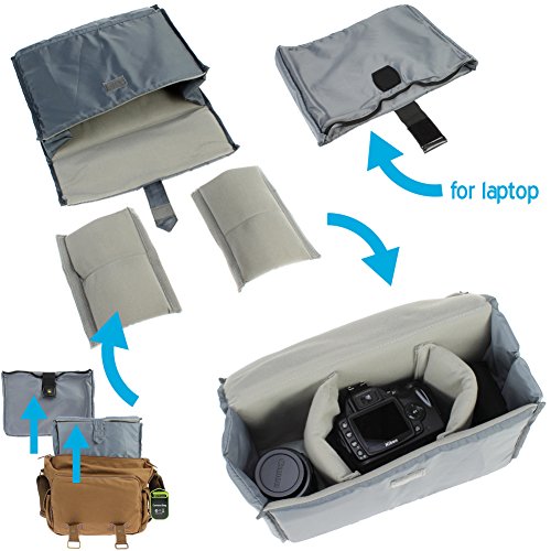 - Feature : Vintage canvas bag w/Rain cover, Tablet/Laptop Compartment and Shoulder Strap Fit for your DSLR camera with 2/3 standard lenses, flash and accessories. / Removable, cinch-top pod with adjustable inner divider to hold camera more sturdy and keep accessories apart. / Removable storage compartment Fit for up to 14inch Laptop/Ultrabook/Chomebook or iPad/Tablet, such as 13.3inch macbook air/Pro. / Easily transform DSLR bag into a casual everyday messenger. / Inner size: L x W x H : 12 x 10.5 x 5.5 inch (Camera and accessories not included.) Compatible for Canon Nikon Sony Panasonic FujiFilm Olympus Pentax and more DSLR Camera