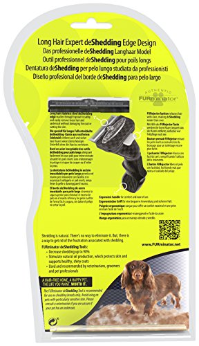 Are you fighting a losing battle with loose hair from shedding? Dogs always have and always will shed. Dog owners will be in this never ending battle as long as dogs live indoors. Most dog owners will tell you that vacuuming is simply not enough. The patented FURminator(R) deShedding tool reduces loose hair from shedding up to 90%*. Any size dog can mean large amounts of loose hair throughout your home. The Medium Long Hair Dog FURminator(R) deShedding tool is specifically designed for dogs from 21-50 lbs. and with coats longer than 2 inches. The stainless steel deShedding tool reaches deep beneath your dog's long topcoat to gently remove the undercoat and other loose hairs without cutting when used as directed. The FURejector(R) button cleans and removes loose hair from the tool with ease. FURminator(R) deShedding tools come in a wide variety of options tailored to your dog's size and coat length.Feature