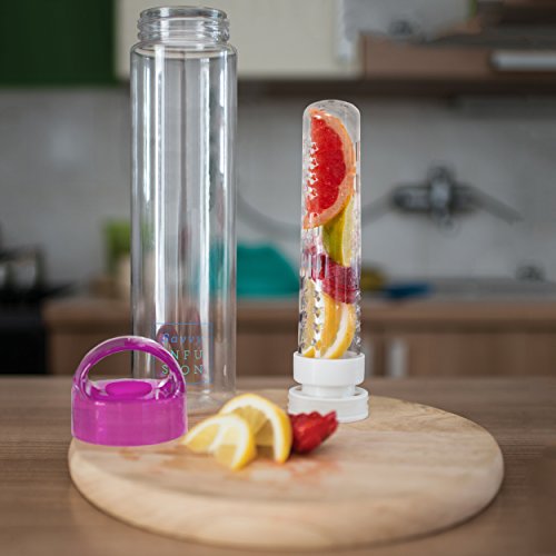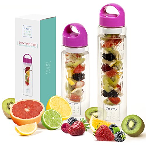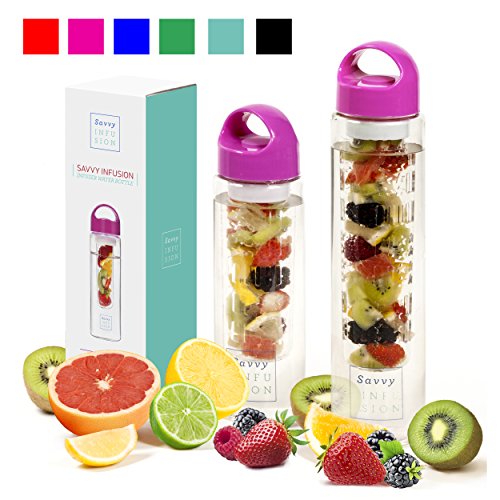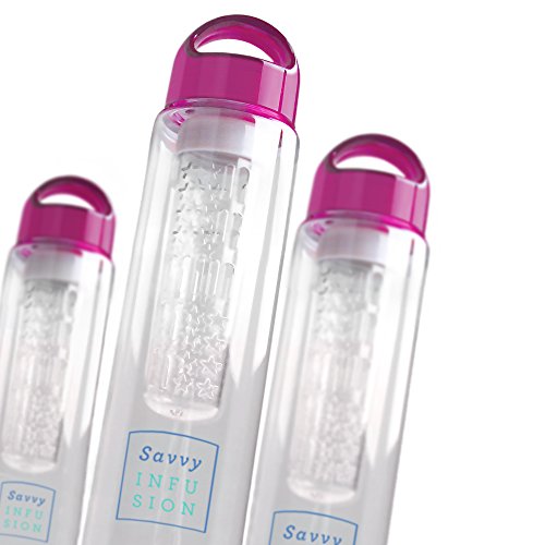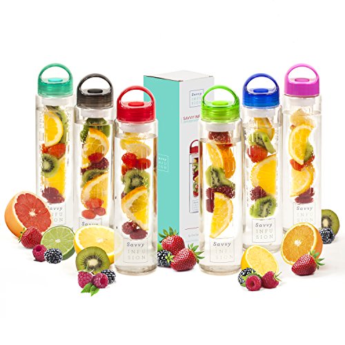 "We really like these infusion water bottles so much! The infusion basket is longer so it goes farther down in the water and we love the top which has a handle making it easier to take with you. These are really the best we have had!" J.D. Ball Your search for the perfect infuser water bottle is finally over. You now have the power to create your own unique infused thirst-quenching beverage. You'll be inspired to drink more water...the easiest way to stay slim, healthy, and energized. A must have for the gym, sports, yoga, hiking, camping, traveling. And think of all the money you'll save. No more buying expensive bottled water, sports drinks, soda or "vitamin" flavored water, which are full of refined sugar and empty calories. So what separates Savvy Infusion from the competition? It's simple really. Savvy Infusion WILL NOT leak. Our unique handled twist-cap style infuser drinking cup ensures a completely spill and leak proof drinking experience -100% BPA Free -Highest quality impact-resistant Tritan plastic. -Chic on-the-go carry handle. -Superior design holds the perfect proportion of fruit and water. -32 ounce size fits perfectly in your car cup holder. - Includes FREE Bonus EBook with delicious recipes. It's because of all this that we're able to make a guarantee unlike any other guarantee you've ever seen. We call it our "100% Absolutely Thrilled or Your Money Back" No Hassle-Guarantee. So order your Savvy Infusion Water Bottle now. Consider getting two...1 for you and 1 for a friend. 0 |