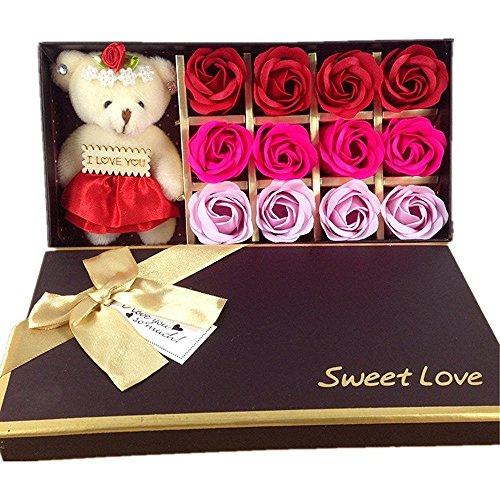Package:12Pcs/Box romantic rose soap flower with little bear.The rose is made of soap which can use to wash hand or bath.
