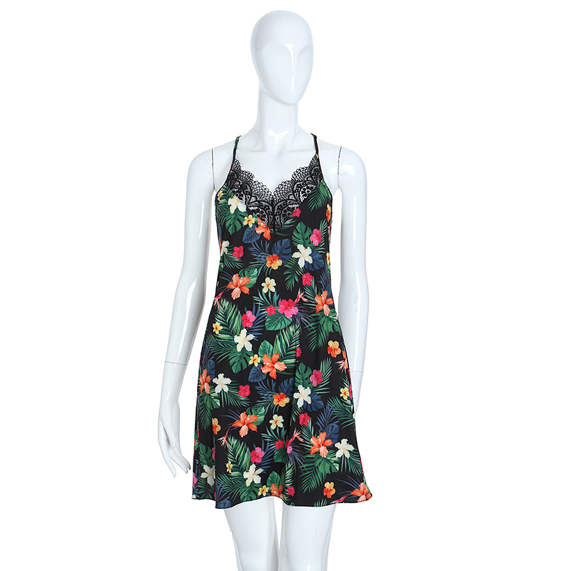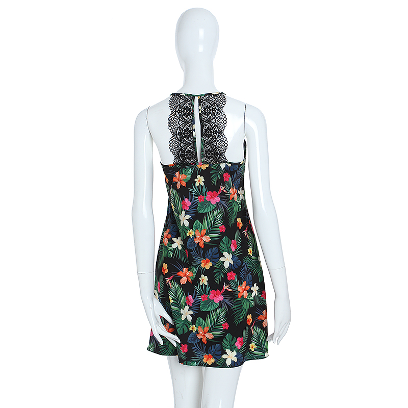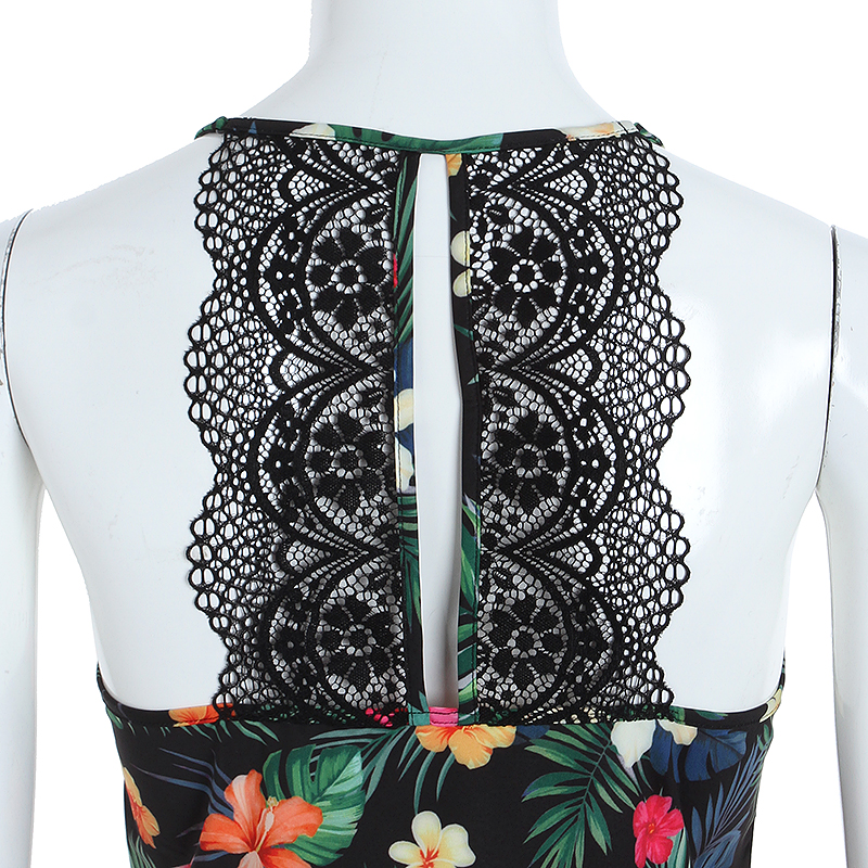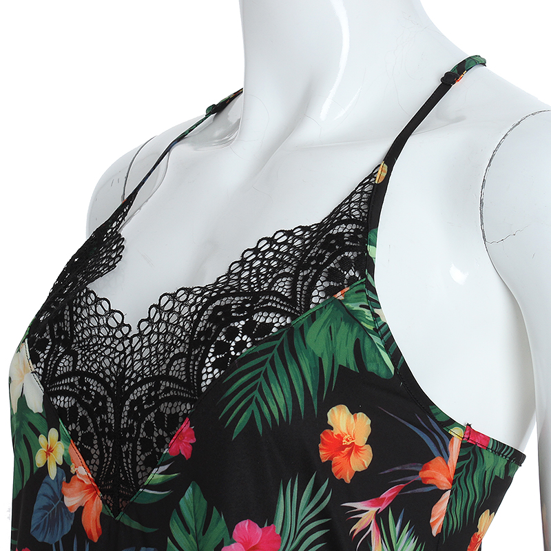 하와이안 프린트를 사용한 화려한 느낌과 BacK레이스와 날개레이스가 새련된 감각을주며