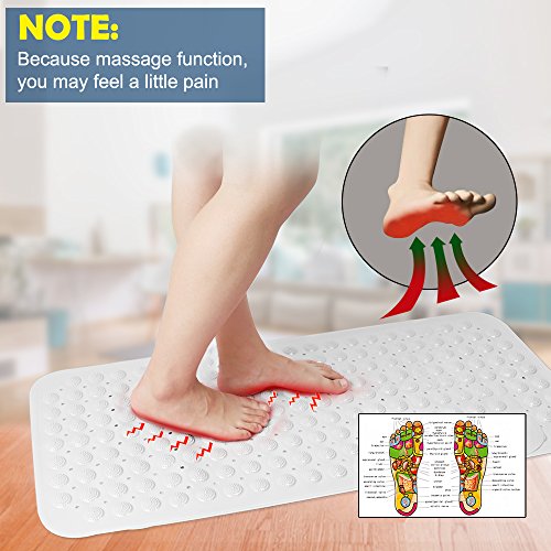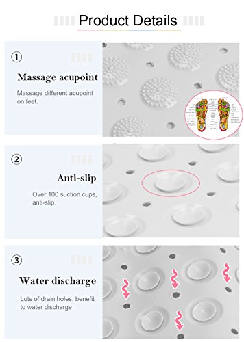 - Sturdy grip covered - With suction cups that once pressed into place adhere firmly to the floor of a tub or shower stall and will not shift or slide when you step on or off; the upper side of the mat is textured, giving your feet extra traction power and comfort that soothes and gently massages tired feet. NOTE: Because massage function, you may feel a little pain