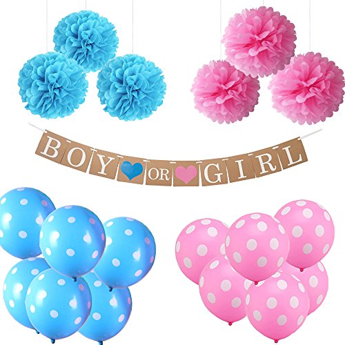 - Pacakage Include:1XBoy or Girl Banner,5XBlue Latex Balloons,5XPink Latex Balloons,3XPink Paper Tissue Pom Poms(10inches),3XBlue Paper Tissue Pom Poms(10inches),1.5Meter Gold Ribbon