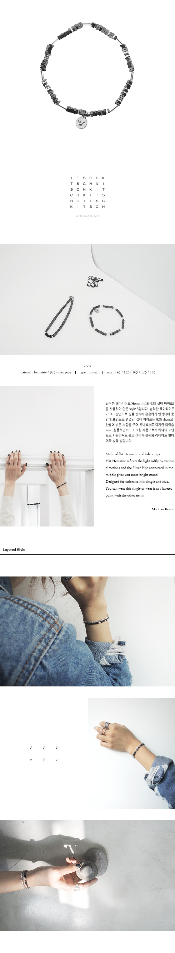 - 주문시 유의사항 : 베리송크(varisonc) 제품으로만 50,000원 이상 구매시 배송비 무료 (배송비 3,000원/도서산간지역 도선료 추가) 줄자, 종이, 끈 등을 활용하여 팔목 사이즈 측정해보시고, 팔목 사이즈보다 약 5mm 크게 팔찌 사이즈를 선택해주세요. 납작한 헤마타이트(Hematite)와 실버 파이프(925sliver)를 사용하여 만든 제품입니다. 납작한 헤마타이트가 여러방면으로 빛을 반사해 은은하게 반짝이며 중간에 포인트로 연결된 실버 파이프는 925 sliver로 한층더 밝은 느낌을 주어 유니섹스로 디자인 되었습니다.