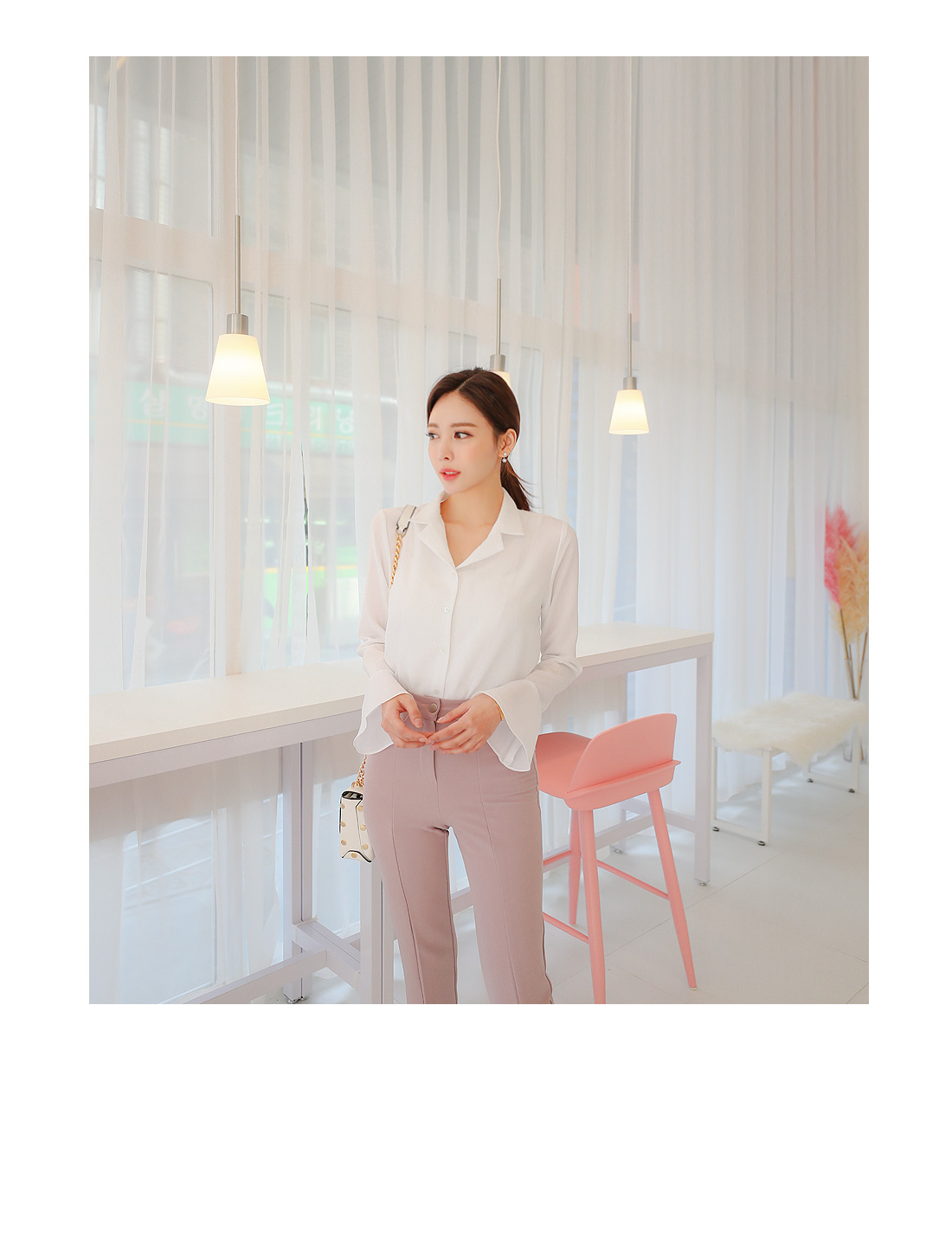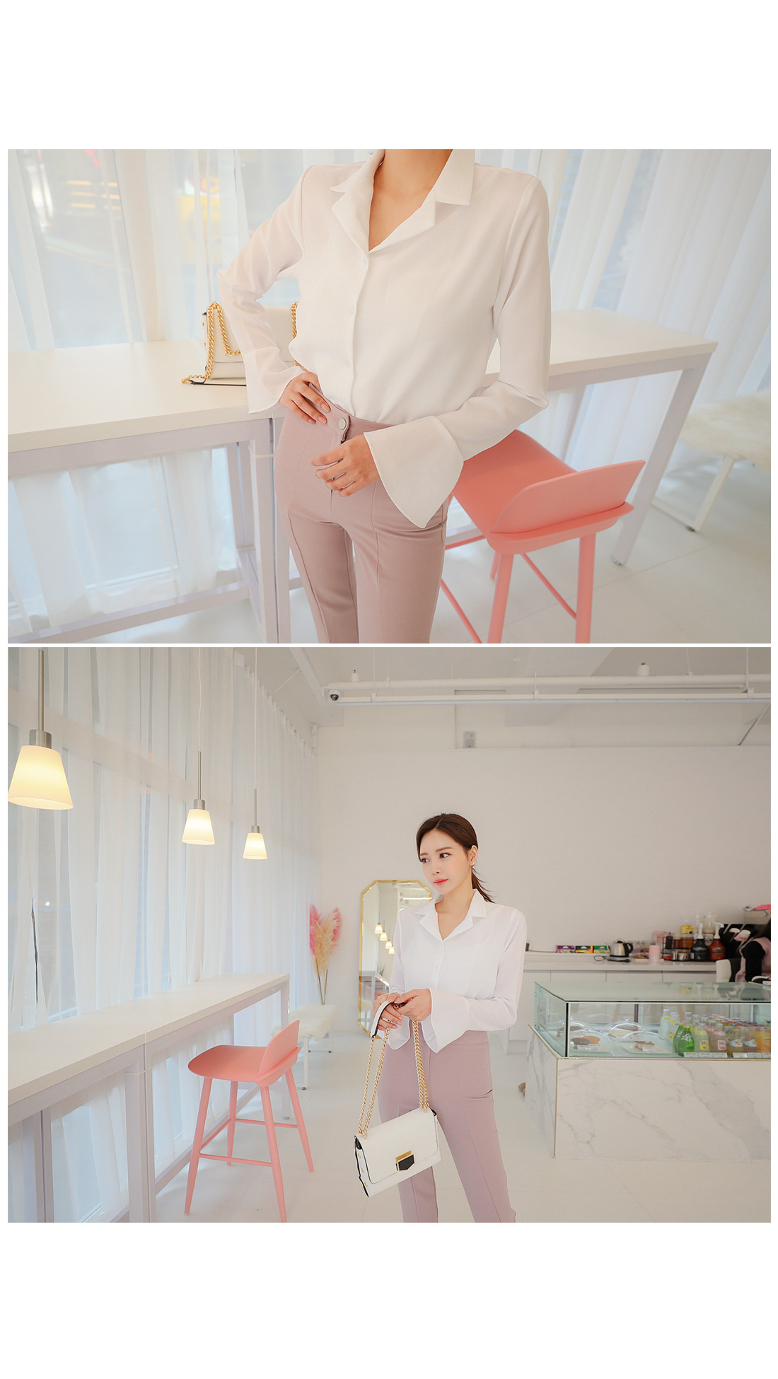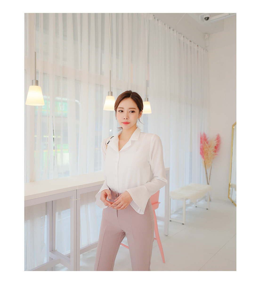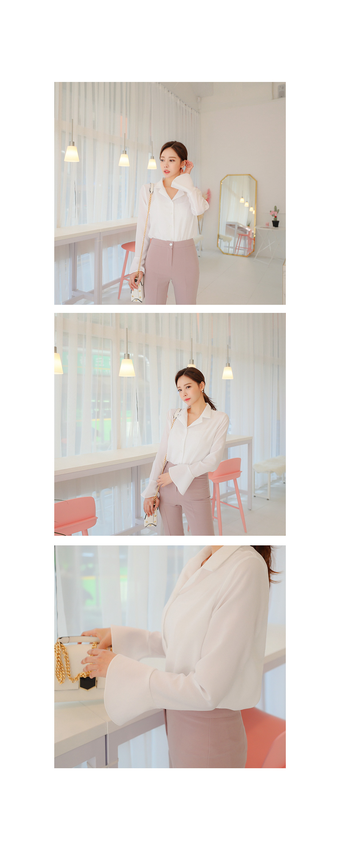 플레어라인 벨소매 디자인으로 포인트를 주어 여성스럽게 매치 하기좋구요.