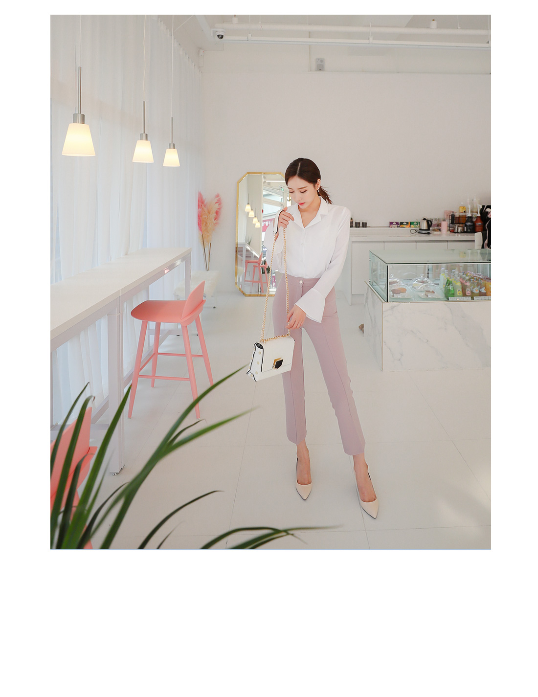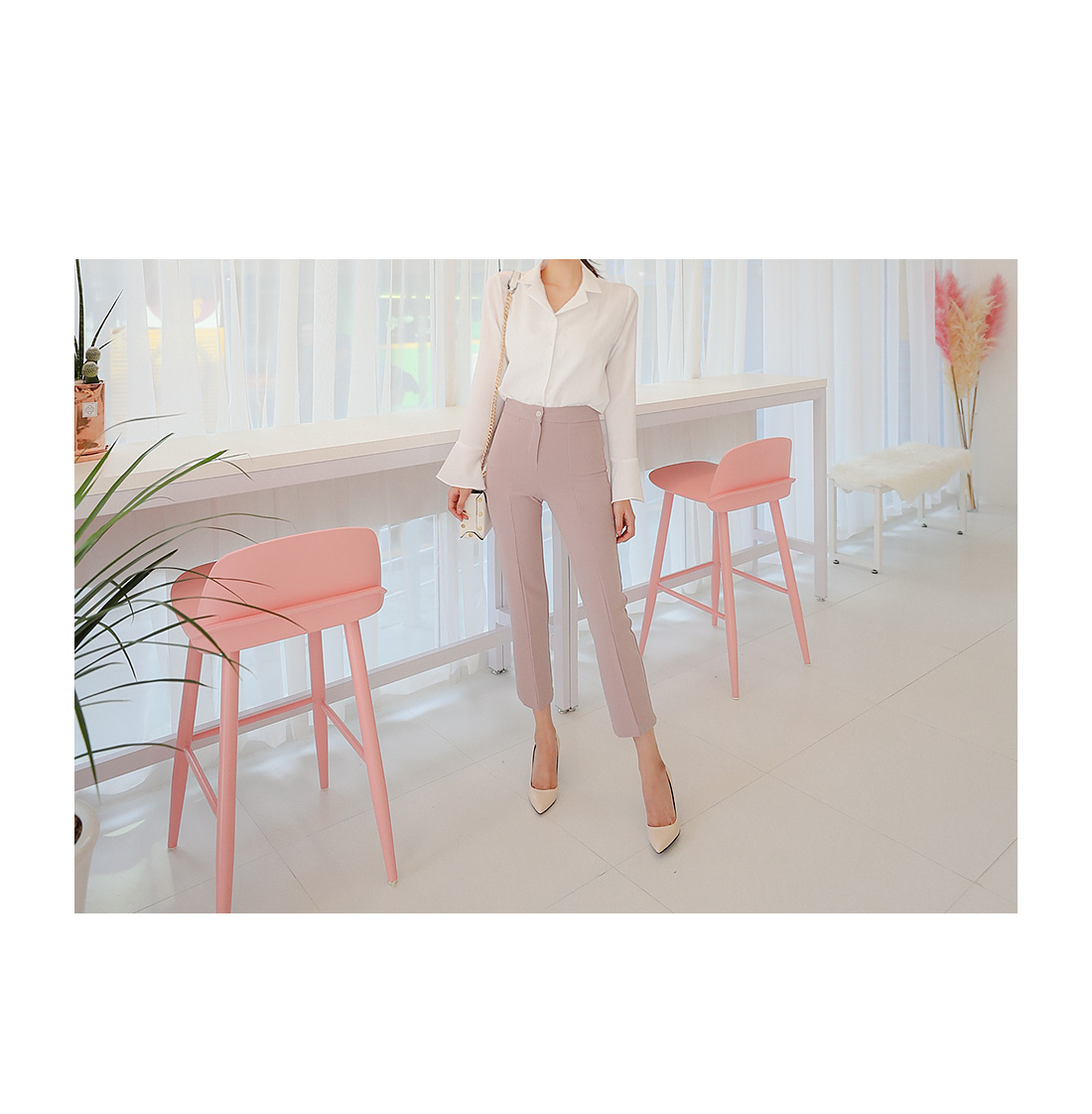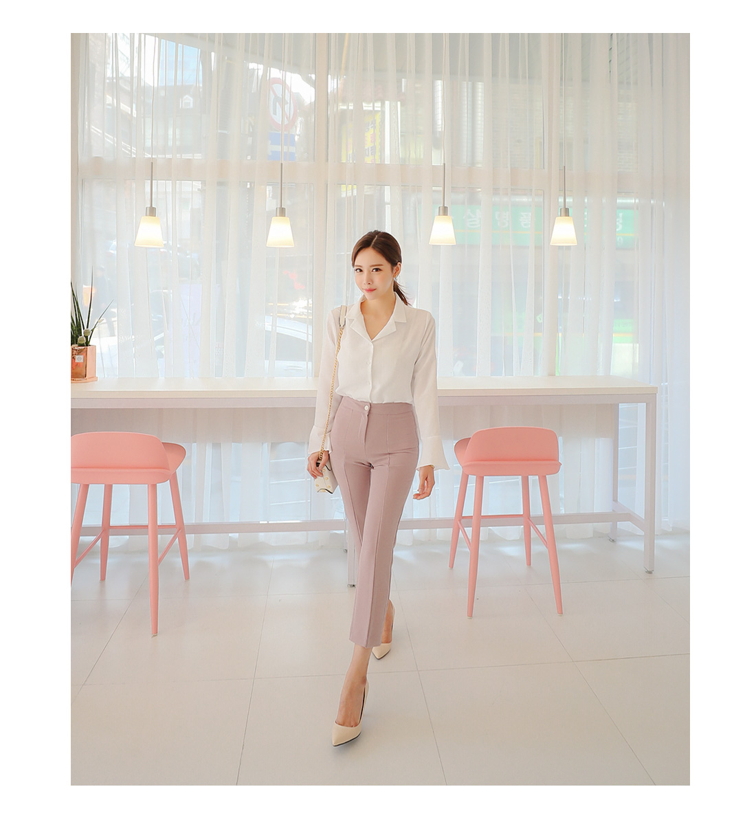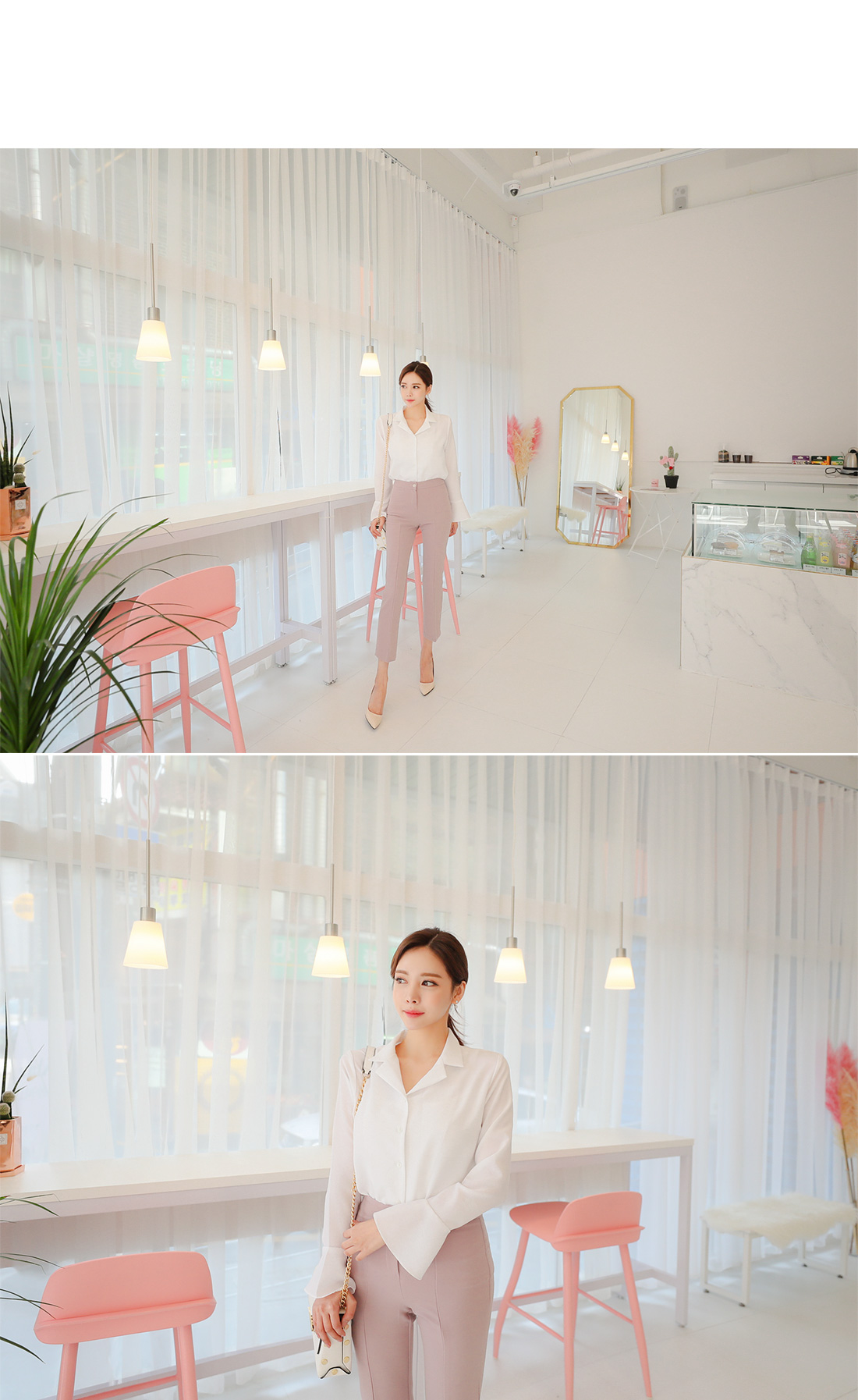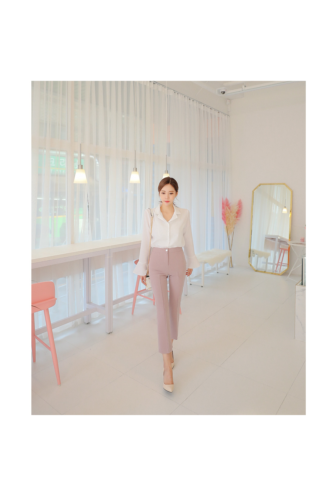플레어라인 벨소매 디자인으로 포인트를 주어 여성스럽게 매치 하기좋구요.