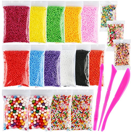 - MCIRCO Foam Slime Balls of 16 Packs: Coming with 11 packs of 0.08-0.15inch foam beads(3828pcs each) + 2 packs of 0.27-0.35inch foam beads(118pcs each) + 3 flower, fruit and cake shaped 0.16inch confetti slices(500pcs each) + 1 pack of 3 pcs slime tools. Total quantity of foam beads are around 50000pcs, 1500pcs of confetti slices.