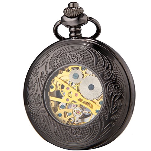 -. Title : SEWOR Vintage Magnifier Skeleton Pocket Watch Black Case Mechanical hand wind