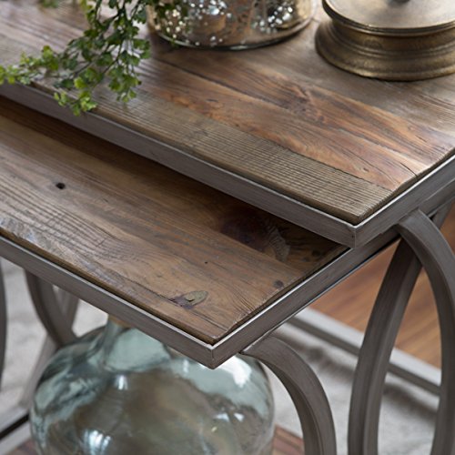 -. Brand : Belham Living -. Color : antique pewter -. Feature : Aged driftwood finish, Hourglass-shaped frames / Each table has 1 stretcher shelf, Includes 2 nesting tables / Genuine reclaimed pine and fir wood top. Each piece is unique and will vary in appearance. Tubular steel frame in hand-finished antique pewter / Small dimensions: 20.75W x 16D x 22H in. / Large dimensions: 24W x 18D x 24.12H in. -. ProductGroup : Furniture -. ProductTypeName : HOME_FURNITURE_AND_DECOR -. Title : Edison Reclaimed Wood Nesting Tables, End Tables