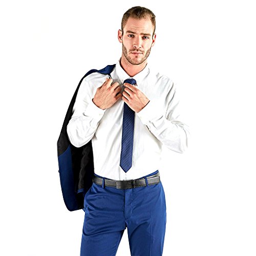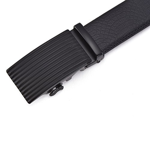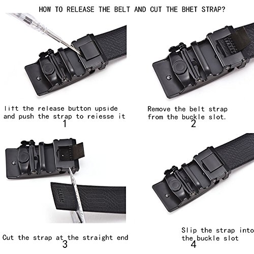 -. Feature : Easy Adjustable: Trim to fit. If the belt is too long for you, you can trim the strap length to fit your size. / Great Ratchet System: The ratchet system adjusts in small increments Far superior to traditional belt design so which provide the perfect fit. You can get the PERFECT fit even if your waistline changes a bit. Perfect fit and save time. / High Quality: Second layer cowhide leather supplemented by Double edge stitching strap, with zinc alloy buckle, composed of elegant men's automatic buckle belt. / Durable and Reliable: Belt buckle and belt body removable and interchangeable. easy removable bulkle allows you to cut the bult to your ideal size. / GIFT BOX + 100% Money Refund Guaranteed: Make a big impression! Enclosed in a lovely, attractive gift box. If for any reason you're not 100% SATISFIED, let us know and our customer service team will make things right: full refund or a free replacement