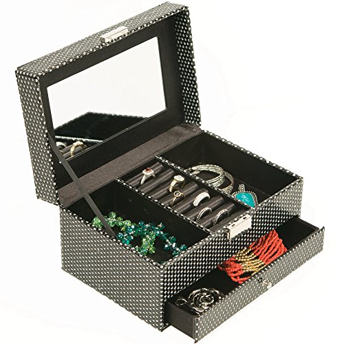 - Seven slot ring roll keeps rings stored upright. Two top compartments offer tons of storage room.