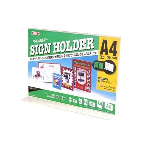 案内板として、メニューやアピールしたい印刷物などをきれいに見せる横型のサインホルダーです。店頭陳列商品のプライスカード・POPカード・商品PRカード・簡単な説明書などを入れることができます。コーヒーショップチェーン店や家具雑貨店・各種ショップでのレジ横の案内板としてもお使いいただいております。 |