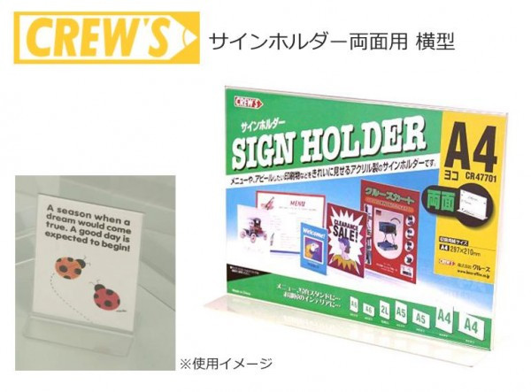 | 案内板として、メニューやアピールしたい印刷物などをきれいに見せる横型のサインホルダーです。店頭陳列商品のプライスカード・POPカード・商品PRカード・簡単な説明書などを入れることができます。コーヒーショップチェーン店や家具雑貨店・各種ショップでのレジ横の案内板としてもお使いいただいております。 |