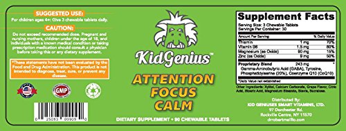 Attention and focusing problems are estimated to affect 1 in 9 kids in the US. It is the number one issue among today's youth. Research shows that immaturity or reduced growth of the whole brain, especially the right side, may be related to attention, concentration, impulsivity and other related issues. KidGenius Vitamins is specially formulated by Dr. Robert Melillo - one of the foremost experts in brain development - to help promote growth and development of the brain. This children's chewable or crushable vitamin is formulated to specifically help promote neurotransmitters specific to the right brain. KidGenius Attention, Focus, Calm is a chewable supplement for kids - all important qualities for kids who struggle with attention and who are extremely picky and have texture issues. About KidGenius Vitamins: Dr. Robert Melillo, the author of Disconnected Kids and cofounder of Brain Balance Centers, has spent decades working with thousands of families to develop a supplement that packs a powerful punch for brain development. Kids can't swallow pills and they typically hate powder drinks because of texture and taste issues. As one of the leading experts in the world in brain development and nutrition, Dr. Melillo has formulated these chewables with a high dose of vitamins that help promote brain development and gut health. KidGenius Vitamins are specially formulated to help with issues like attention, focus, academics / learning, memory, motivation, and gut health. While we have used natural sweeteners for our product, the taste or mouth feel might be off for your child, especially young children. In that case, we recommend crushing it and placing in a favorite food for the same impact. The flavor is a very sweet grape type of flavor for children.Feature