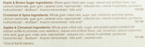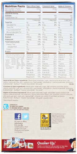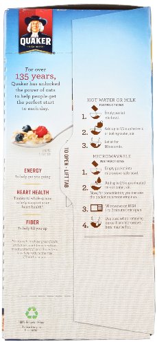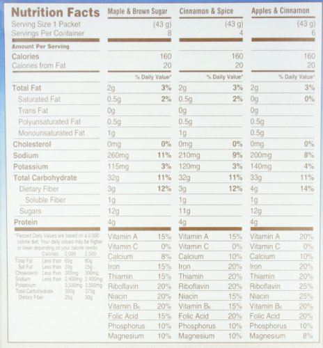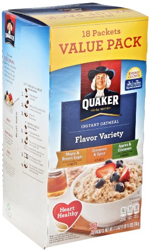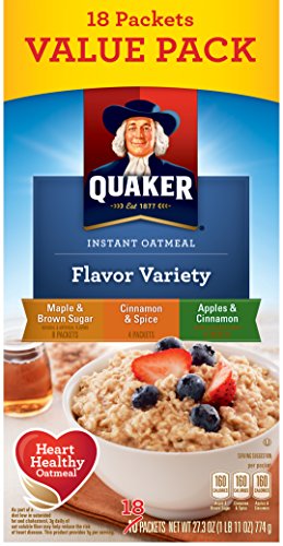 -. Feature : Includes 8 Packets Maple & Brown Sugar, 4 Packets Cinnamon & Spice, and 6 Packets Apples & Cinnamon / Sweet flavors of apples and cinnamon, cinnamon and spice, or maple and brown sugar / Portable single-serving packets are easy to prepare and ready to eat in 90 seconds / Quaker Instant Oatmeal is made from 100% whole grain Quaker Oats / Heart Healthy Whole Grains (*Diets rich in whole grain foods and other plant foods and low in total fat, saturated fat, and cholesterol may reduce the risk of heart disease.)