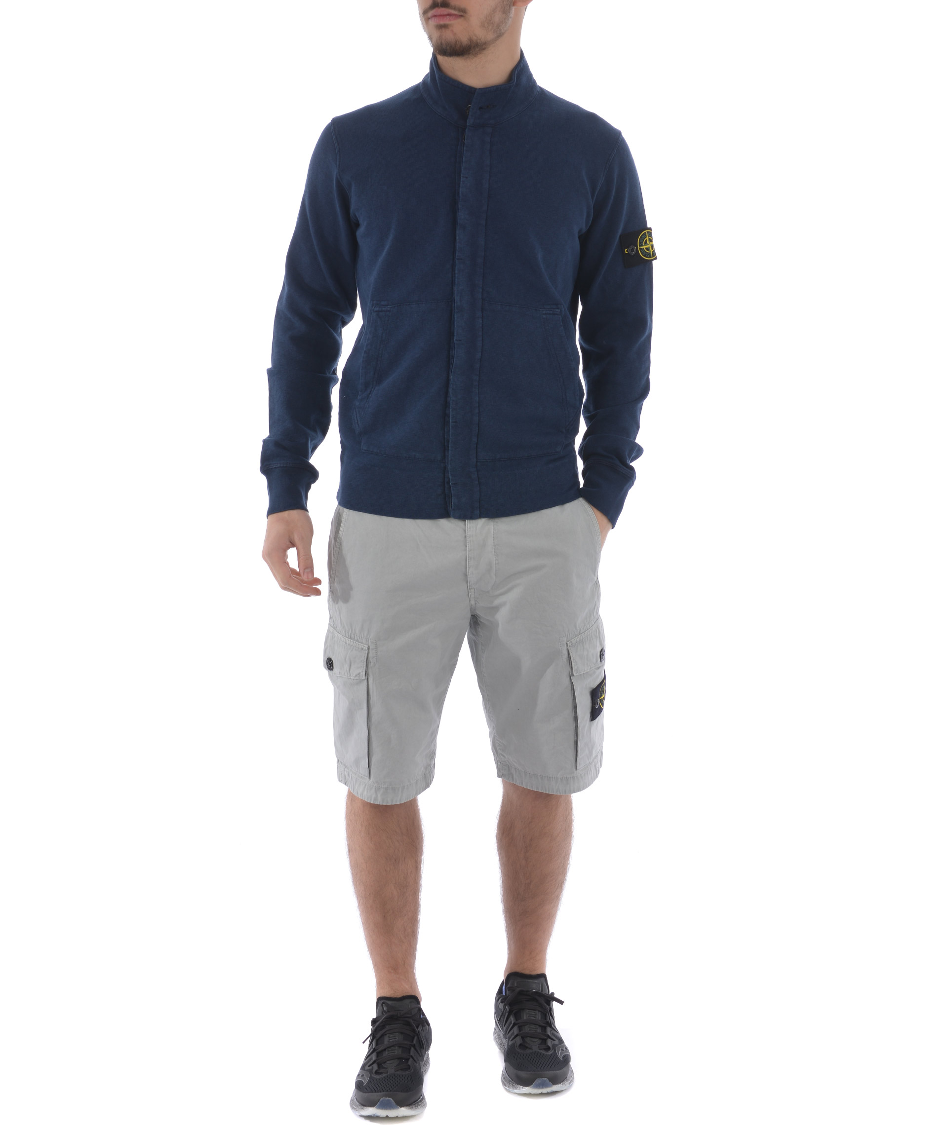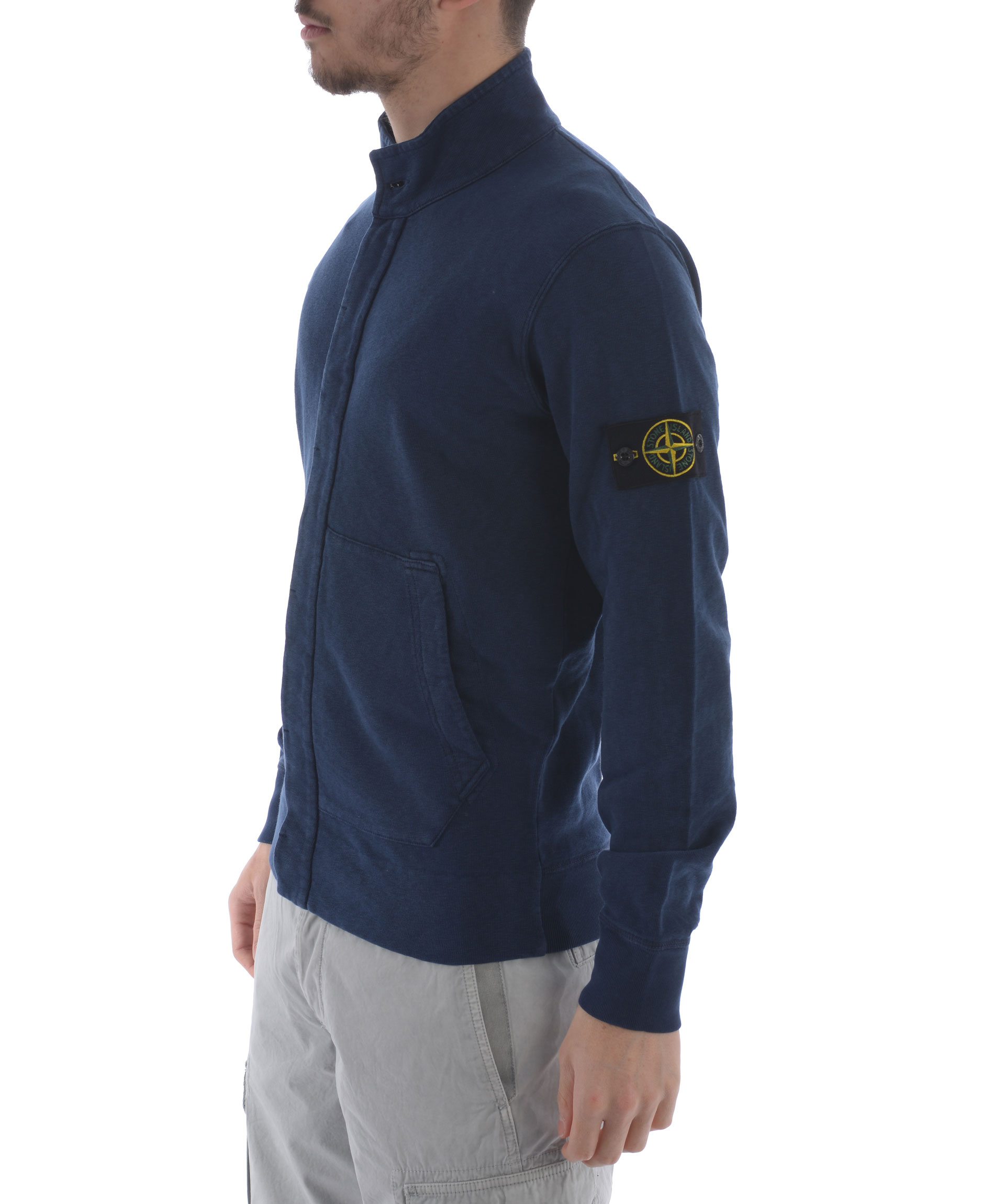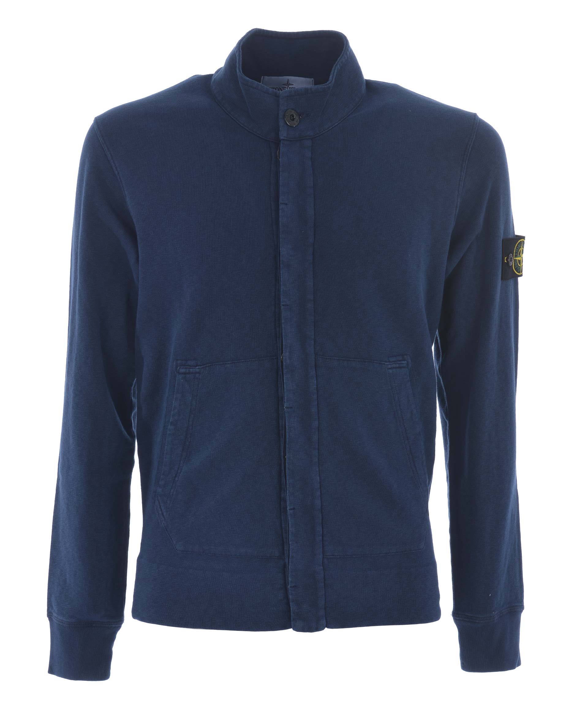 Felpa Stone Island in cotone malfilè Blu effetto old. Collo alto con bottone. Chiusura con bottoni coperti. Tasche frontali. Polsi e fondo a costine. Patch logo in lana sulla manica sinistra, removibile. Misura in foto S 100% cotone