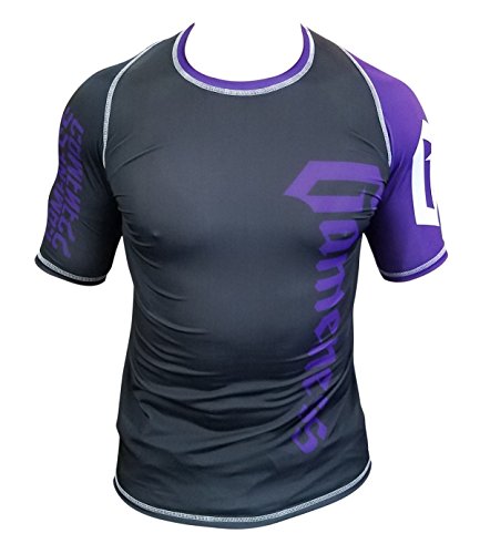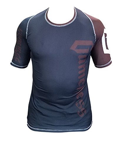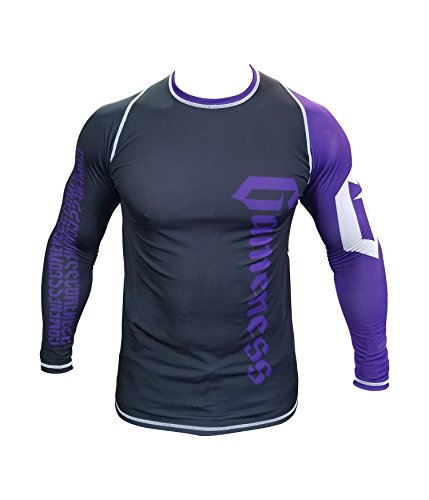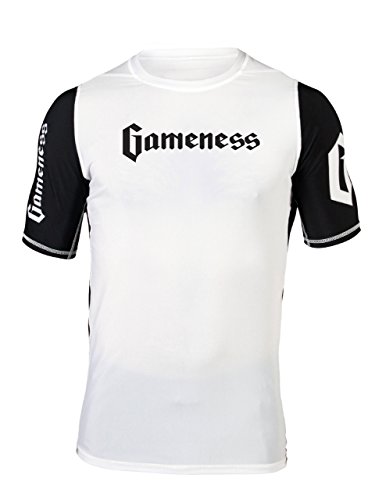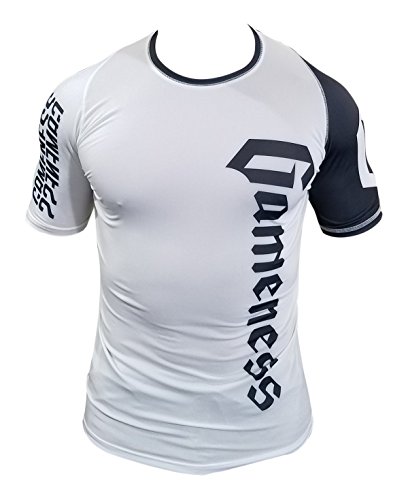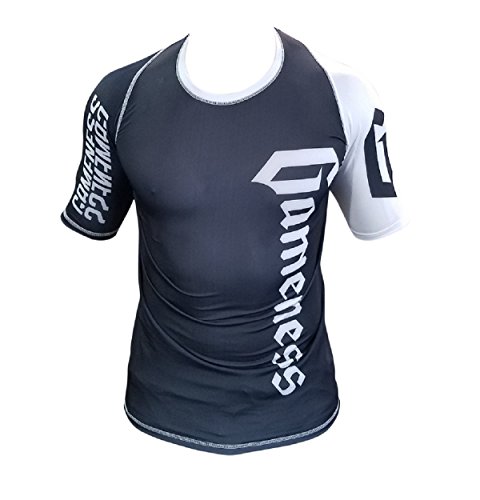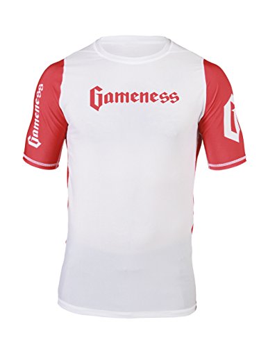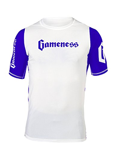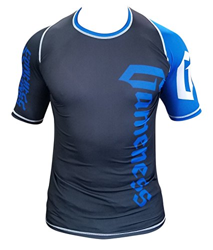 The Gameness Logo Ranked Rash Guard features comfortable and strong flat lock stitching, dyed-into-the-fiber graphics that will never peel or fade, and moisture wicking fabric. The fit was designed specifically for jiu-jitsu and MMA. The Gameness development team worked with professional athletes to get the cut and design just right, featuring just enough compression in the arms and loose compression in the body. Perfect rash guard for men, boys, girls, and women for nogi or mma.Feature