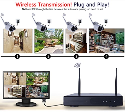 -. Feature : 720P HD WIFI IP Camera: Clear & Crystal Image;Plug&Play,No Ethernet cables are required for cameras / IP66 Weatherproof housing cameras for indoor/ outdoor use with long range 20m WIFI / Mobile phone remotly view anytime, anywhere via internet, smartphone, and tablet;No need to do router forwarding / 4CH NVR with HDMI/VGA Output Simultaneously , Motion detection recording,email alert / Built in 6mm Lens ,48pcs Infrared LED, view up to 75 feet IR distance.A video about how to install this system:https://youtu.be/gMIvdtIv9O8