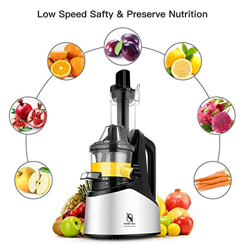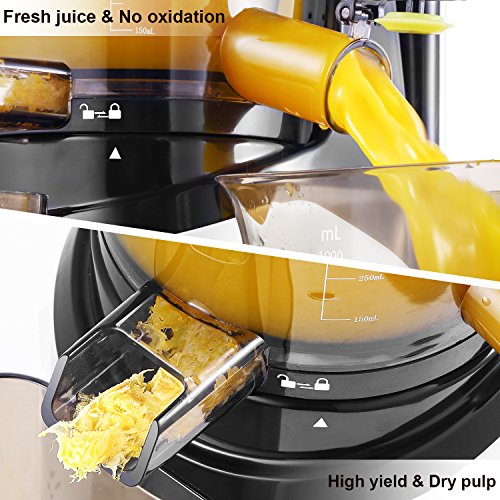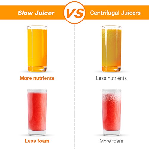 LOW SPEED MINIMAL OXIDATION MASTICATING JUICER: Top Quality 240W AC motor with low speed of 60 RPMs, means less foaming, no clogging, or heat build-up, and prevents oxidation, more healthy. The masticating juice extractor extracts more vitamins, enzymes, minerals and trace minerals in the juice compared to centrifugal juicers, preserving natural taste & nutrients lost by high-speed centrifugal juicers.