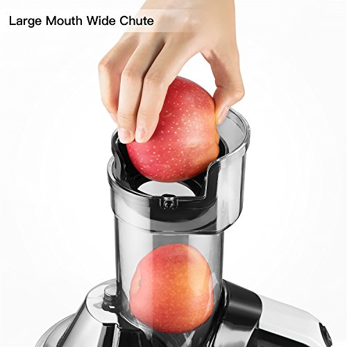 LARGE MOUTH JUICER WITH BABY MATERIAL: 3" inches Wide Feeding Chute for whole fruits and vegetables process which saving the slice and pre-cut time. The silicone components and the PEI juicing screw are made of high quality TRITAN food grade anti-oxidation materials.Try to juice orange, apple, tomato, cabbage, carambola and celery, All of this fruits are making a good juicing yield. Best big mouth machine you never meet before.