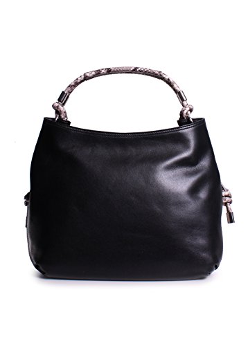 -. Feature : Butter calf cow leather; lining: polyester / Exterior features shiny rhodium-tone hardware and python-embossed detail / Interior features logo-P.R.Int lining, 1 zip pocket, 2 utility pockets and key clip / 7"L single handle; 21"-23"L detachable, adjustable strap / Large sized bag; 14"W x 10"H x 6"D
