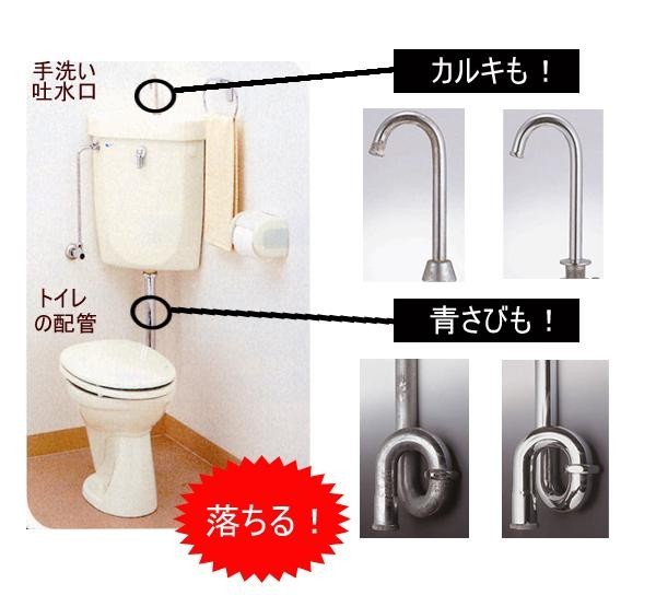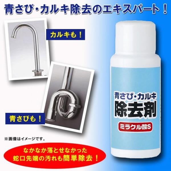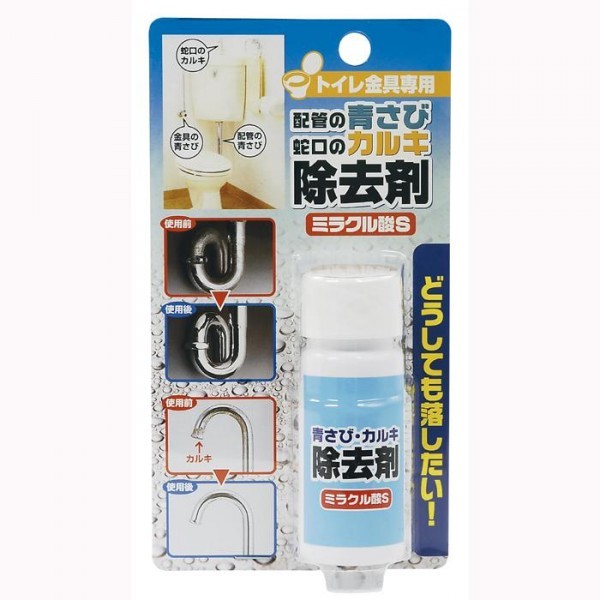 【使用方法】 ・換気扇の利用や窓を開けて室内の通気性をよくして、ゴム手袋にて作業してください。 ・配管や他の金属の青さびはハブラシでブラッシングするか、布に液をたっぷり染み込ませて5~6回往復する事により確実に除去できます。 ・蛇口先端のカルキ除去は、付属のキャップを先端にさきにセロハンテープで止めてから液をキャップに注いでください。約1時間位でカルキが分解します。落としきれない場合はもう一度繰り返してください。取り終わったら必ず濡れ雑巾で良く拭き取ってください。