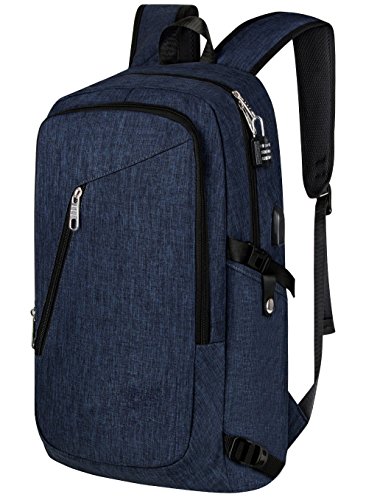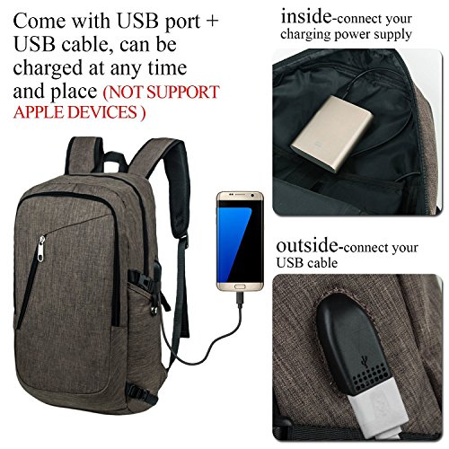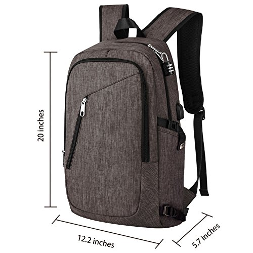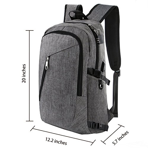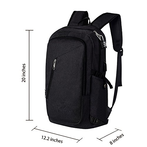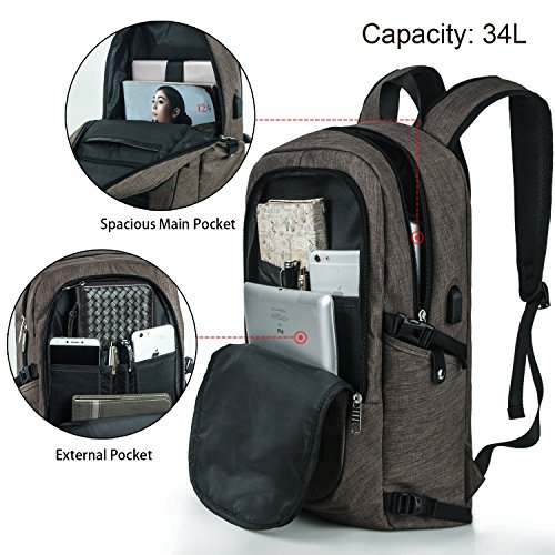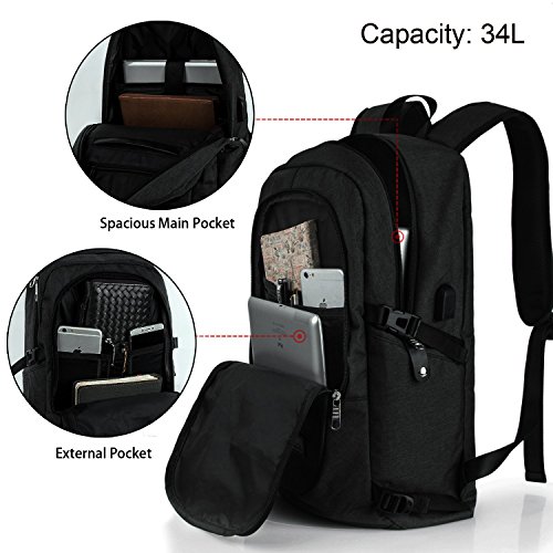 -. Feature : Waterproof Computer Laptop Backpack,Dimensions: 21.1 x 12.2 x 8.1 inches, Capacity: 34 L. Integrated padded laptop compartment holds laptops with screens LESS than 17" / Charging USB Port Design: Put your Portable Charger into backpack and connect internal USB charging cable, then let your charging cable insert external USB charging port to connect your electronic device / Multi Functional Compartments: 2 Main Pockets with 9 Inner Pockets, 2 Easy-Access Side Pockets, 1 Outside Zipper Pocket. Big capacity for holding your Laptop/Notebook/iPad/iPhone, pen, keys, wallet, purse, books, clothes, bottle and more / Safety Guaranteed: anti-theft backpack with anti-theft dual mental-zippers, and a flecxible lock makes your wallet and other valuables safe / Cleaning & Maintenance: wash at normal atmospheric temperature,Avoid staining and alkaline detergent; Hang to dry and store in ventilated place instead of sun exposure; ;Not 100% waterproof. It's not recommended long time in the heavy rain.