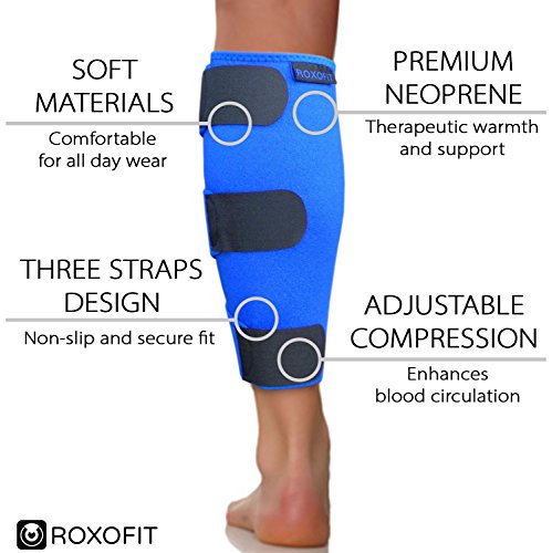 Roxofit Shin Splint Support – Compression Calf Brace for Calf Muscle Pulls, Tears, Strains, and Tennis Leg. Adjustable Wrap Provides Recovery and Prevents Injuries, Fits Men and Women. Blue