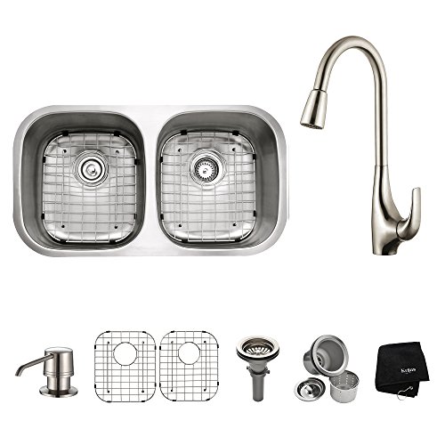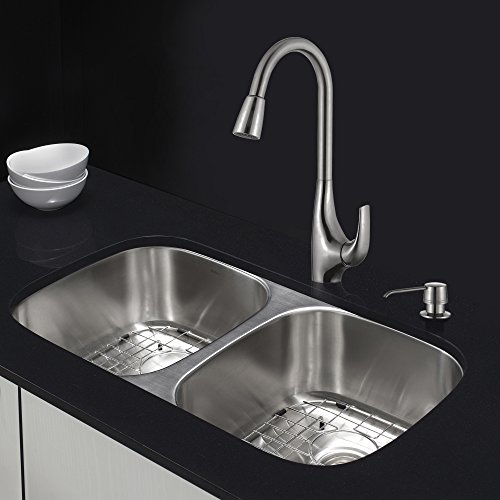 Kraus KBU22-KPF1621-KSD30SS 32 inch Undermount Double Bowl Stainless Steel Kitchen Sink with Stainless Steel Finish Kitchen Faucet and Soap Dispenser