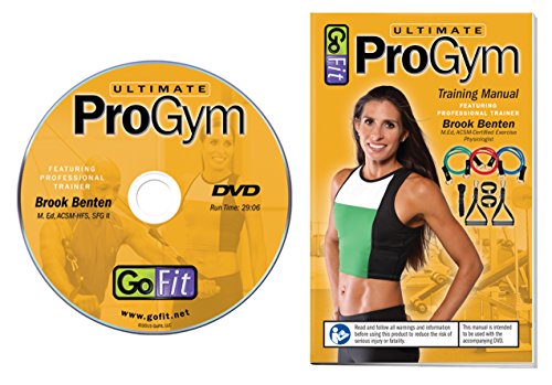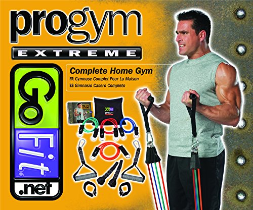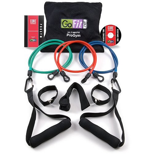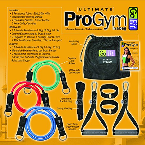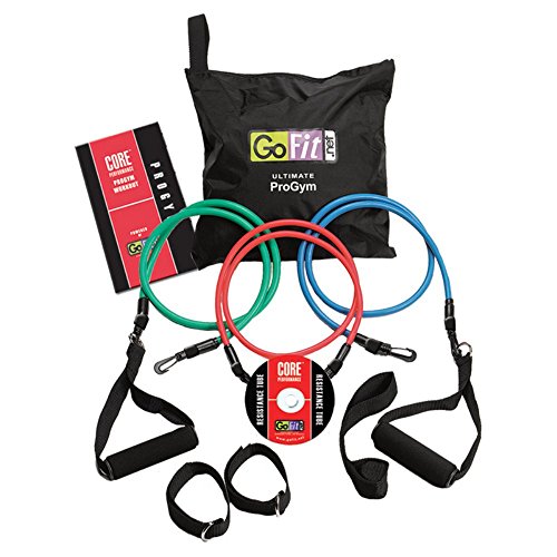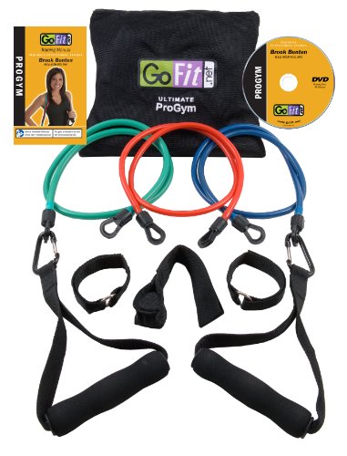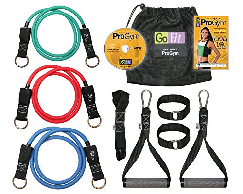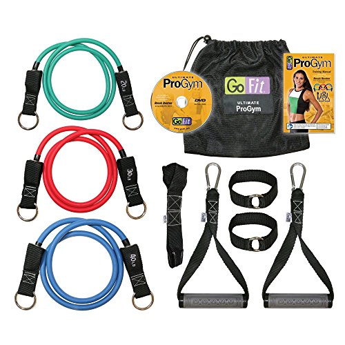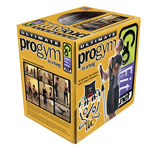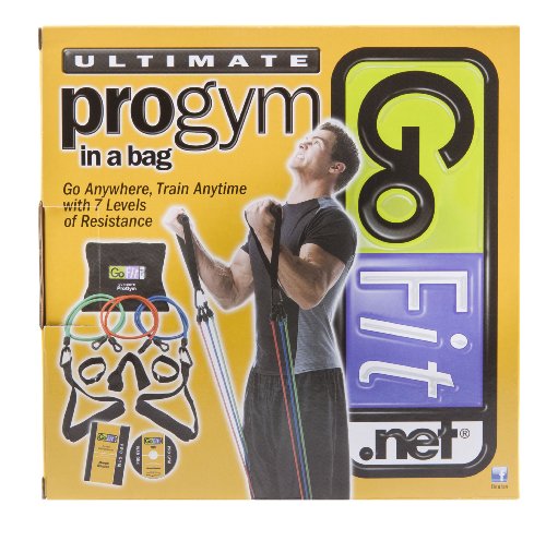 Amazon.com Product Description The GoFit Ultimate ProGym is the go anywhere, train anytime home gym that comes complete with its own personal trainer on DVD. Whether you are building size and strength, or increasing muscle definition, the key to the ProGym is the ability to add or subtract resistance. You can obtain 7 levels of resistance by creating different combinations of the tube strengths. Regardless of your fitness level, the GoFit Ultimate ProGym will help you attain a healthier you! The ProGym contains two handles, three resistance tubes, two ankle straps, one door anchor, an exercise wall chart and renowned fitness model and personal trainer Lynda Leene's own 25 minute workout on DVD. A mesh carry bag is included for storage or travel. 0