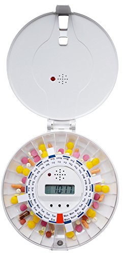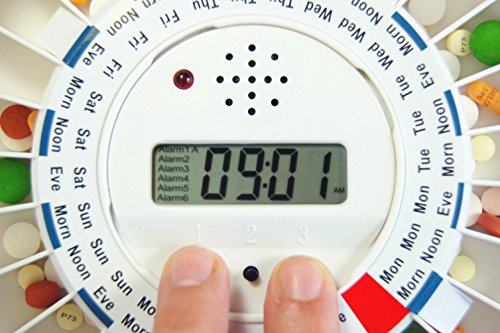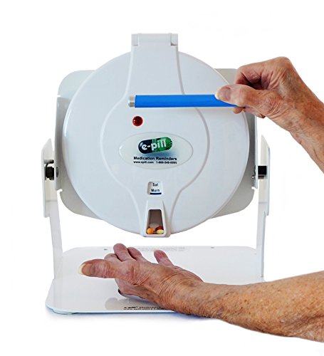 Easy to Use Locked 6 Alarm Automatic Pill Dispenser for Home or Institutional use. No Monthly Fees. This e-pill Medication Reminder helps Mom or Dad live independently at home. Popular pill box with alarm. Never Forget or Double Dose Again with the e-pill STATION! The e-pill Station comes with everything you need; automatic pill dispenser, lock, keys (2), tipper with handle, stainless steel medicine dispensing cup, batteries (4 X AA), four "sticky feet" to secure your e-pill Station and manual.? Battery life 6 months. ? For home or institutional use. ? Easy to use pill dispenser. How-It-Works: Alarms and Dispense up to Six (6) times per Day. Works similar to a Kettle Tipper / Tea Tipping device.Great for patients with medication-induced tremors, or limited dexterity. When the alarm is sounding / light is flashing (alarm duration up to 30 minutes), simply move the blue handle forward to dispense medications into the medicine cup. Pills drop into the medicine cup (re-usable stainless steel dispensing cup is included) when the handle is moved forward. The alarm/blinking light is automatically turned off. Dispensing schedule: 1 time per day - refill tray every 28 days (4 weeks) 2 times per day - refill tray every 14 days (2 weeks) 3 times per day - refill tray every 9 days 6 times per day - refill tray every 7 days (once per week). Securing Dispenser: The e-pill Station has sticky feet (or can be screwed down to a tabletop) and holds up to 18 Aspirin sized tablets per dose.Pill dispenser should be kept locked (2 metal keys are included). 0 |
